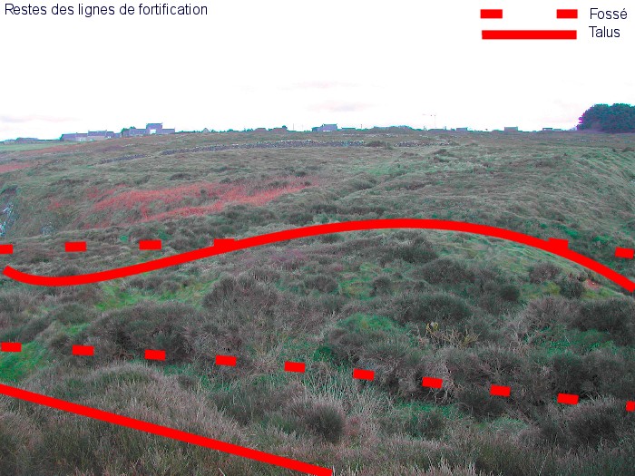 L'entrée de l'oppidum était défendue par quatres lignes de fortifications et par trois douves profondes, le dernier rempart mesurant 4 mètres de haut sur 9 mètres de large.