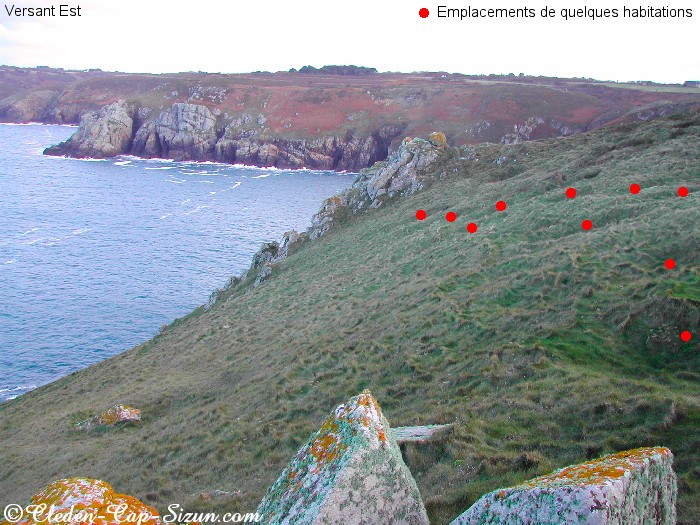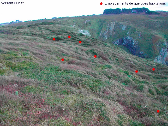 De nombreuses traces de vie primitive y sont présentes. Sur les deux versants, les stigmates d'une présence très ancienne sont visibles sous forme de rectangles ou l'herbe pousse plus verdoyante qu'ailleurs. Ces habitations étaient au nombre de 95, 44 sur le versant Ouest et 51 sur le versant Est. Elles étaient toutes construites de la même façon : rectangulaires, l'entrée coté mer, dans le sens de la pente mais à sol horizontal, ce qui obligeait leurs constructeurs à creuser d'avantage à une extrémité qu'à l'autre. Une épaisse couche de cendre indique une destruction par le feu.